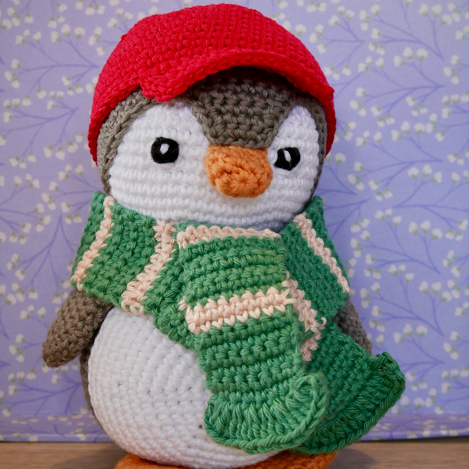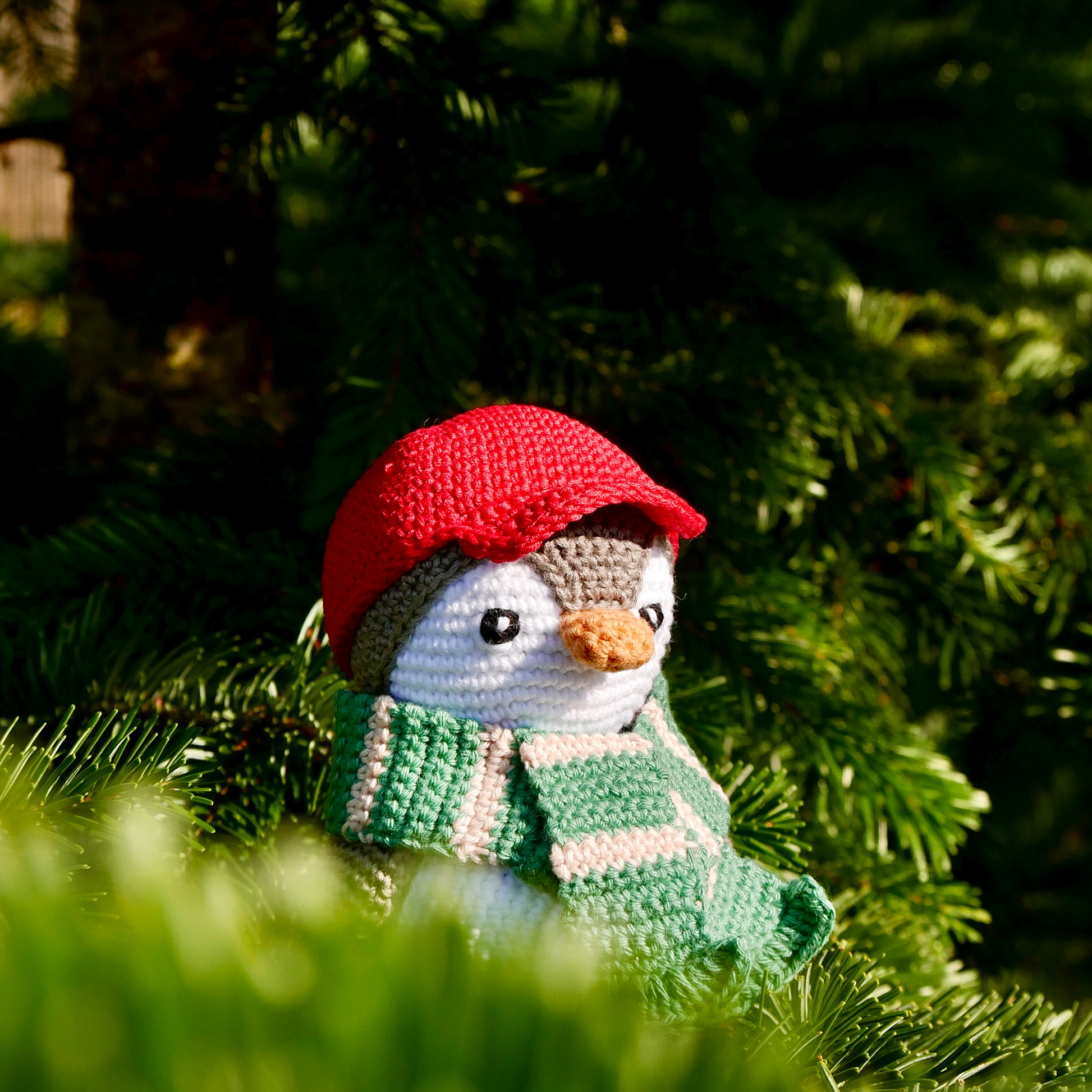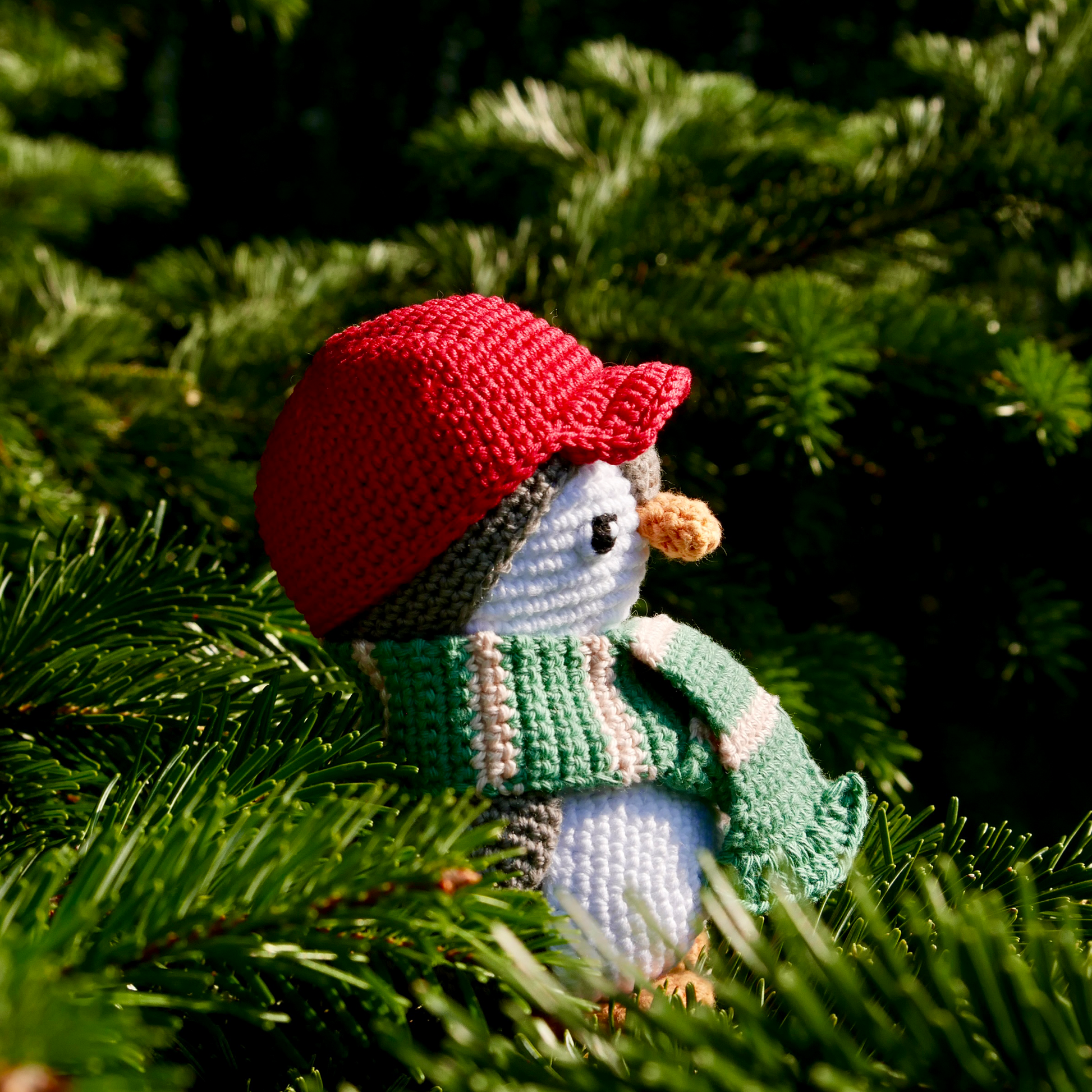 PINO porte ici une casquette rouge et une écharpe bicolore verte et rose pour se protéger du froid.