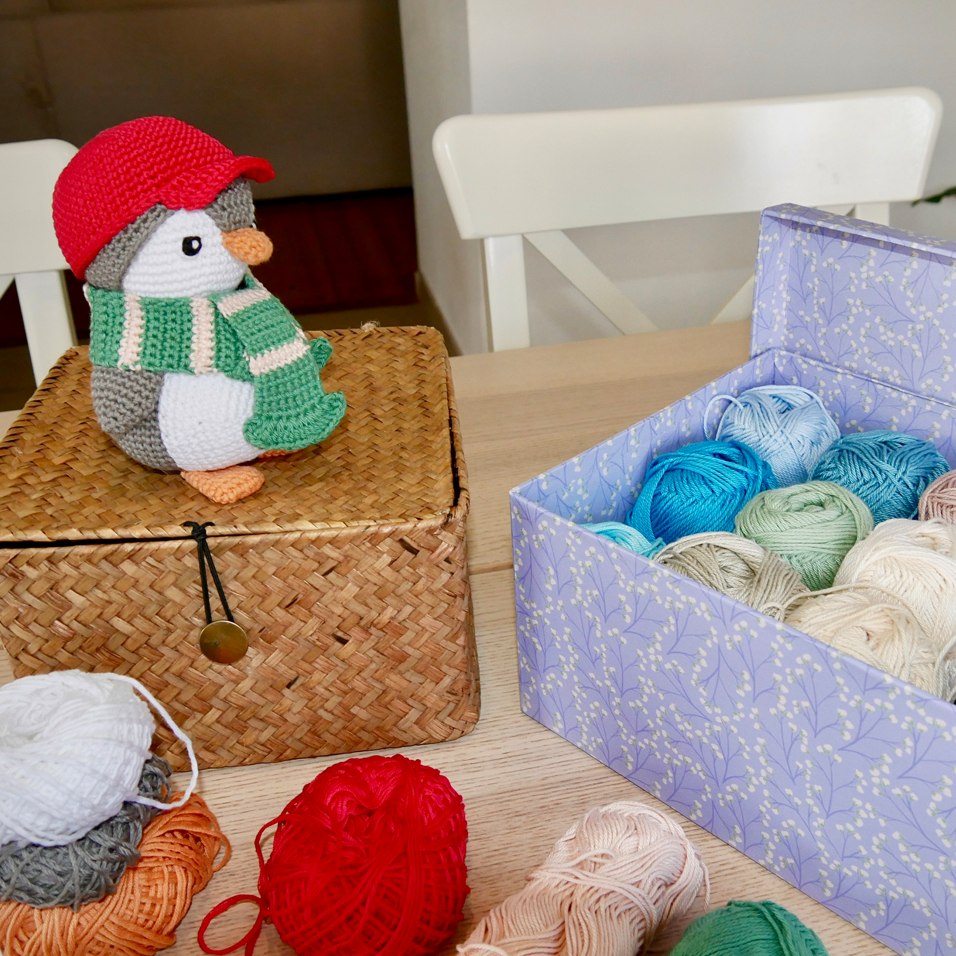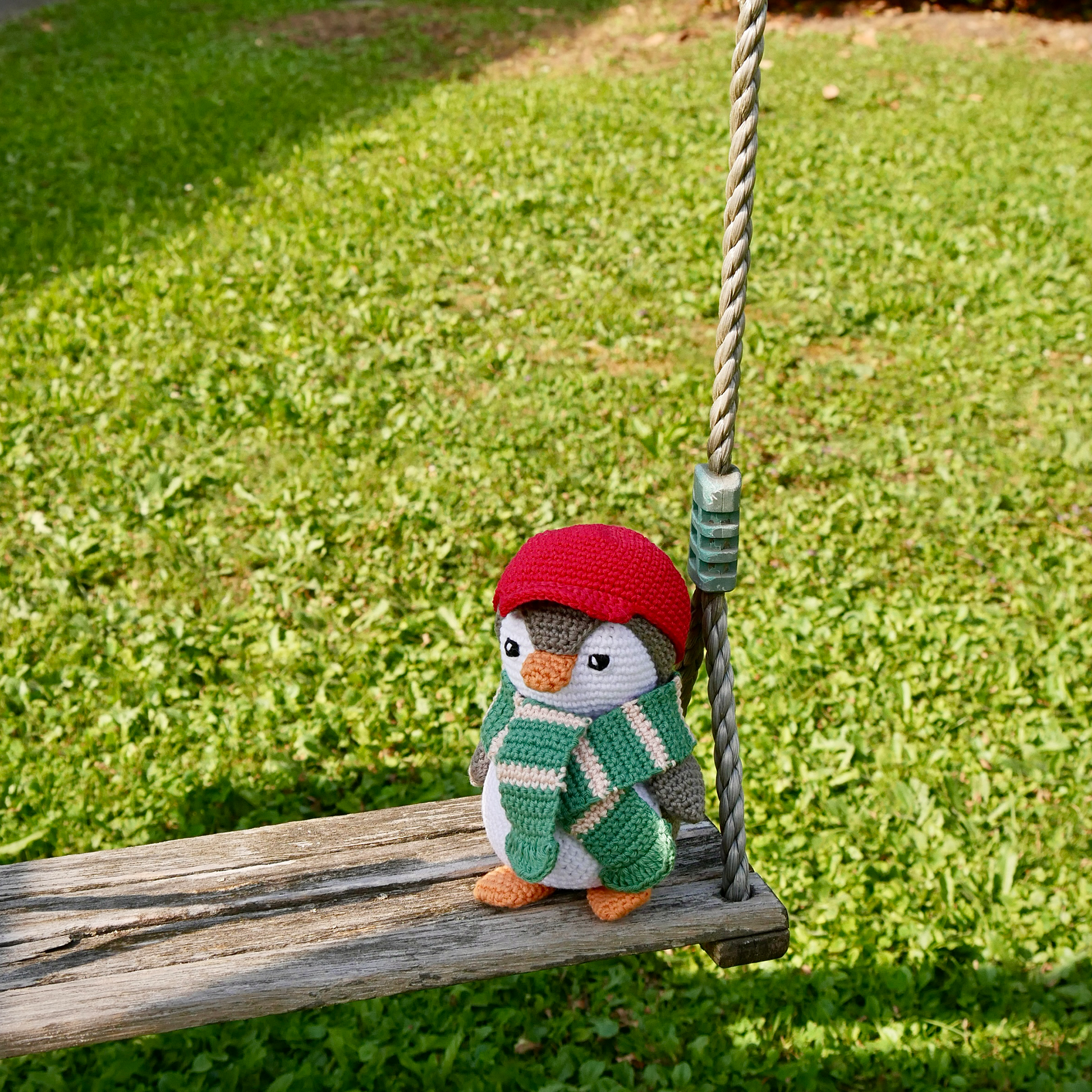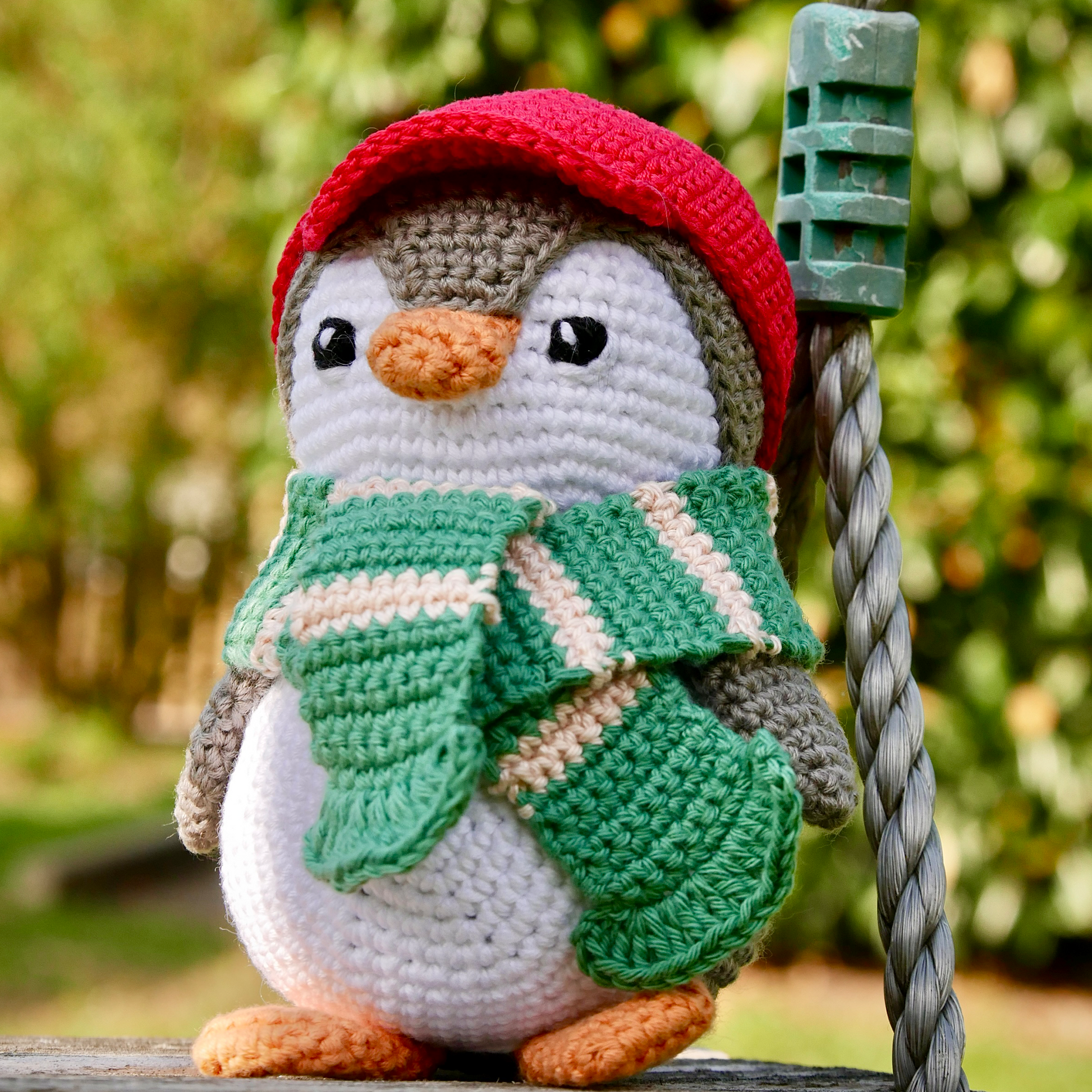 PINO porte ici une casquette rouge et une écharpe bicolore verte et rose pour se protéger du froid.