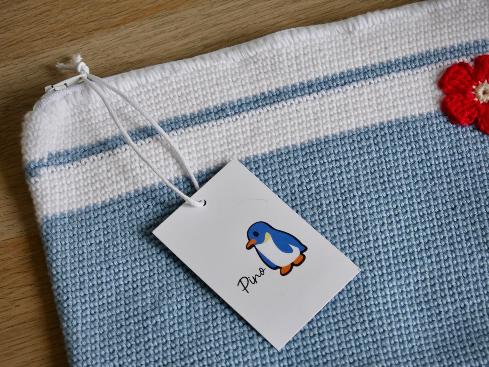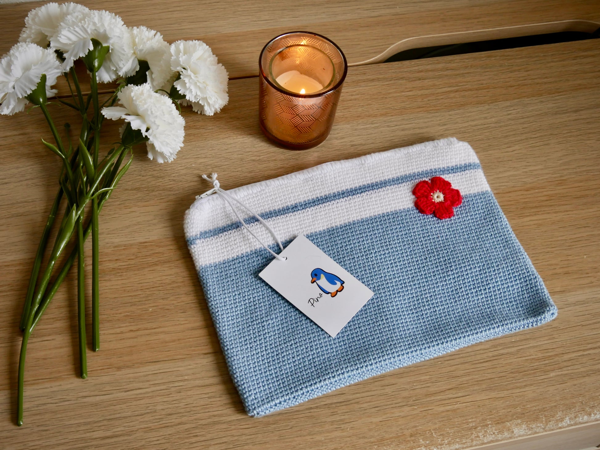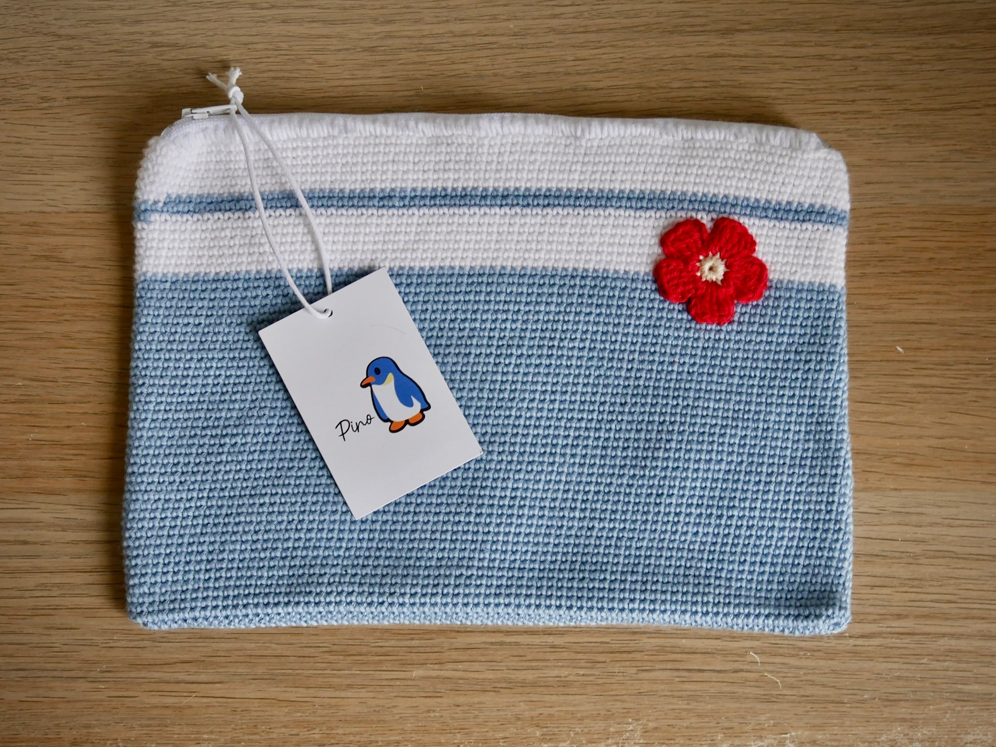 Cette saison, la trousse est disponible en version rayée bleu pour un style intemporel propre à PINO.