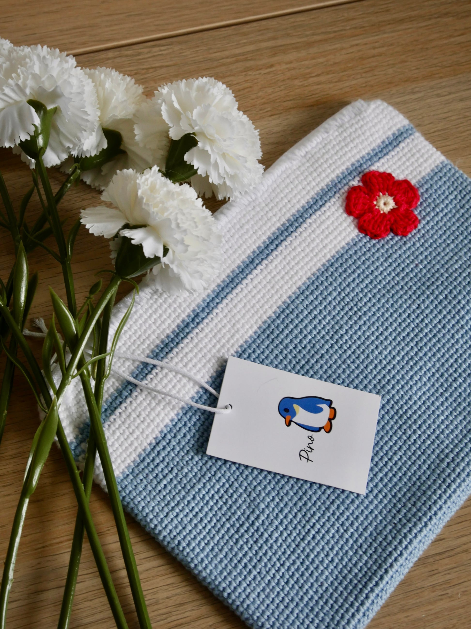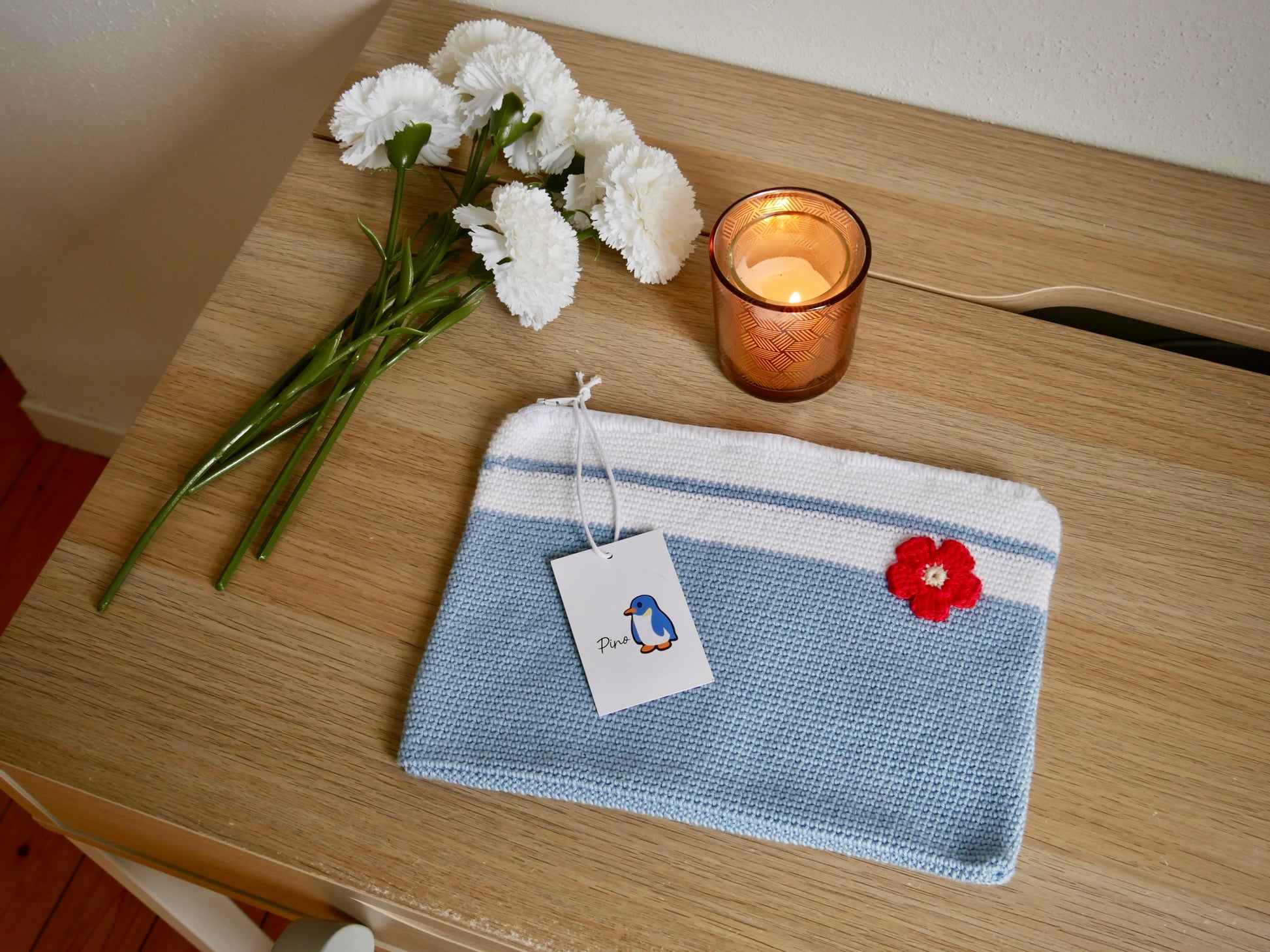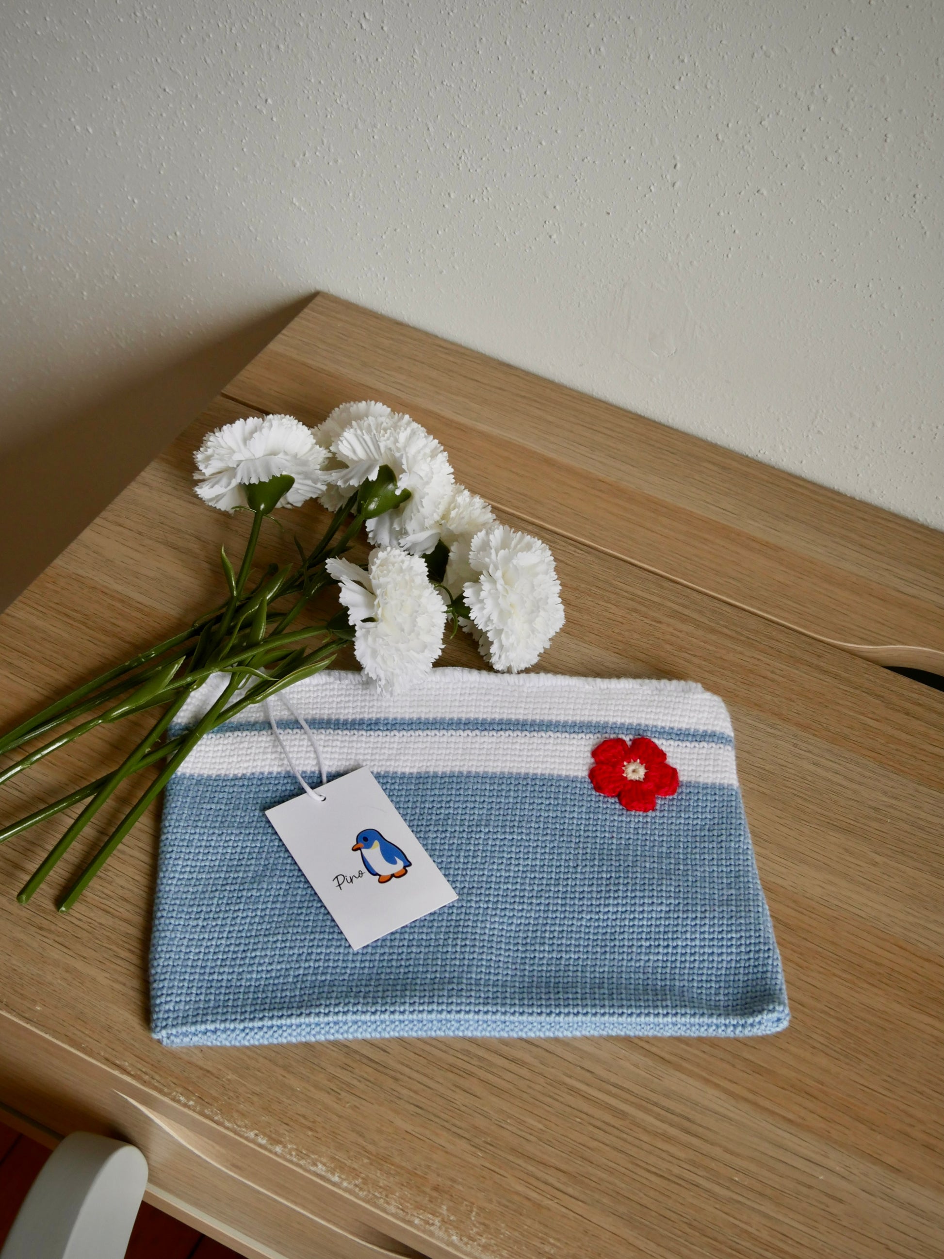 Cette saison, la trousse est disponible en version rayée bleu pour un style intemporel propre à PINO.